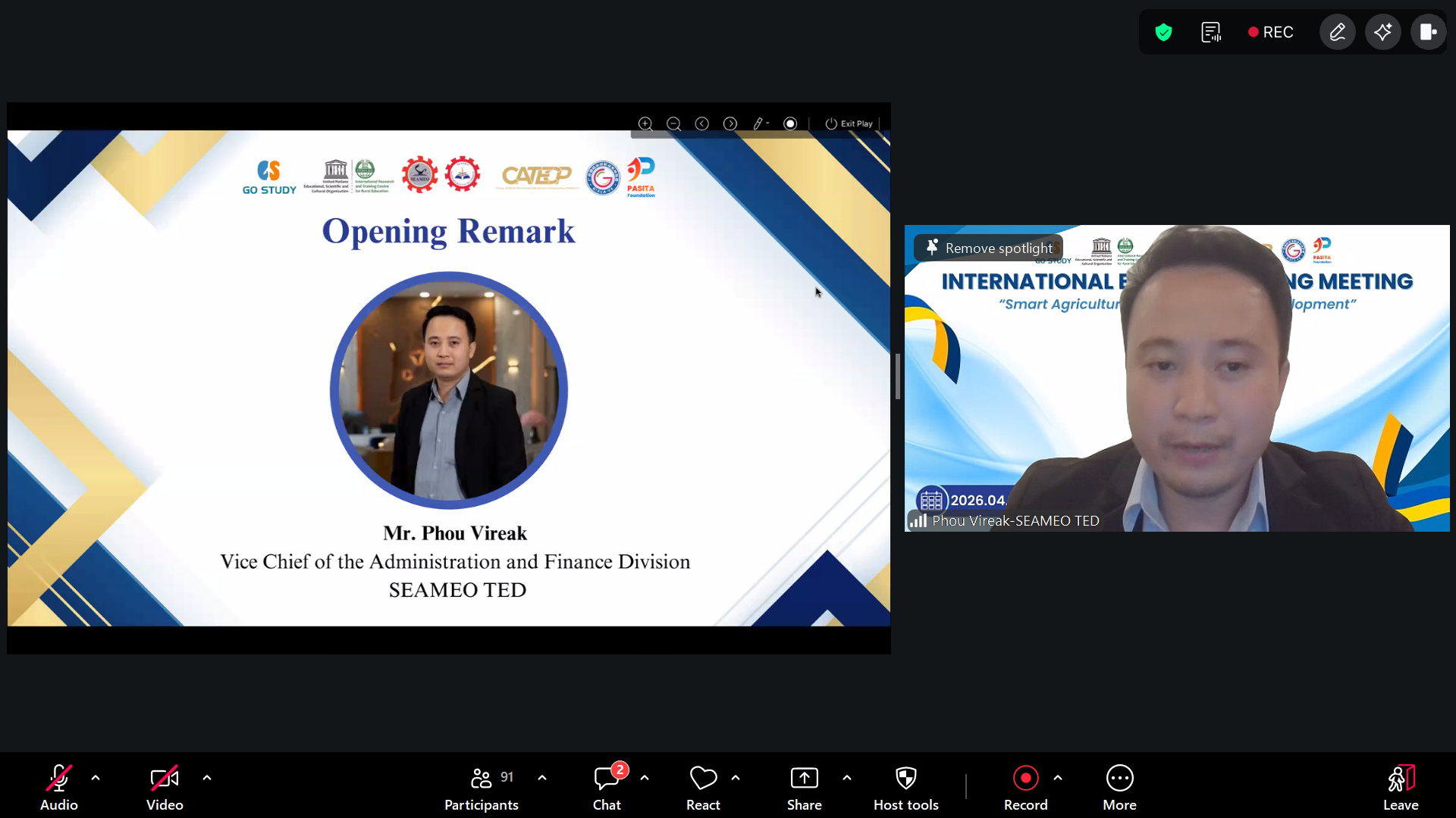 The first opening remark was delivered by Mr. Phou Vireak, Vice Chief of the Administration and Finance Division of SEAMEO TED. He emphasized on how rural development is the main key to a lot of countries. In today repeatedly changing world, rural development is important for a lot of countries. In order to do it, it is necessary to improve productivity, ensure the field security, and create sustainable innovations especially for the agriculture sector. Later he mentioned that dialogue, knowledge exchange and international collaboration are needed in order to understand not only the ways to develop our countries’ rural communities by adapting to new emerging technologies but also to addresses the challenges that are faces by rural communities nowadays. Lastly he encouraged the participants to be actively engaged in the discussions with the experts in order to gain more knowledge on the topic discussed.