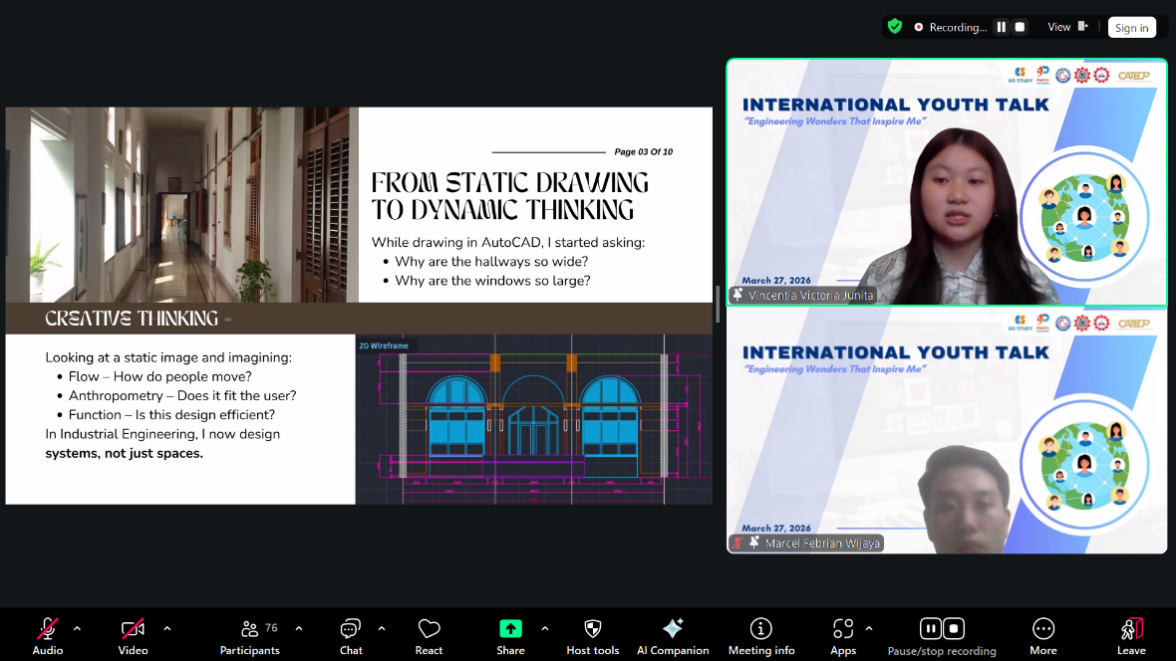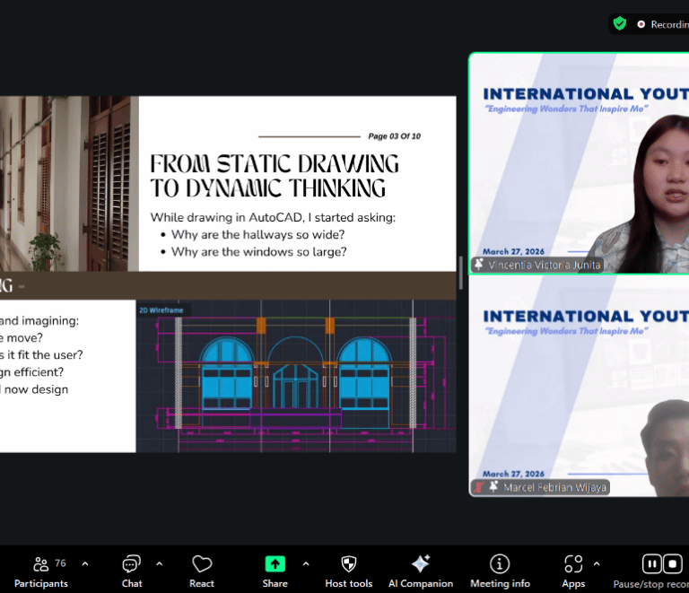 The representative team from the University of Surabaya explained how engineering thinking can evolve from simple observations in design to advanced technological applications. They introduced the concept of ergonomics, emphasizing that effective design must fit human bodies and user needs, illustrated through examples such as differences in door height based on human anthropometry. The speakers also discussed how tools like AutoCAD help engineers create precise floor plans, visualize spatial relationships, and improve efficiency in design processes. Additionally, they highlighted the potential of machine learning in engineering, explaining how it can support applications such as quality control, demand forecasting, and fatigue prediction in ergonomic workstations. Through their presentation, the speakers emphasized that future engineers must think efficiently, creatively, and use technology to design systems that make future work easier.