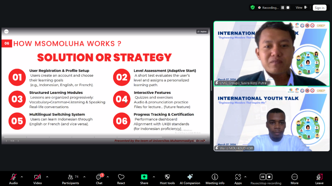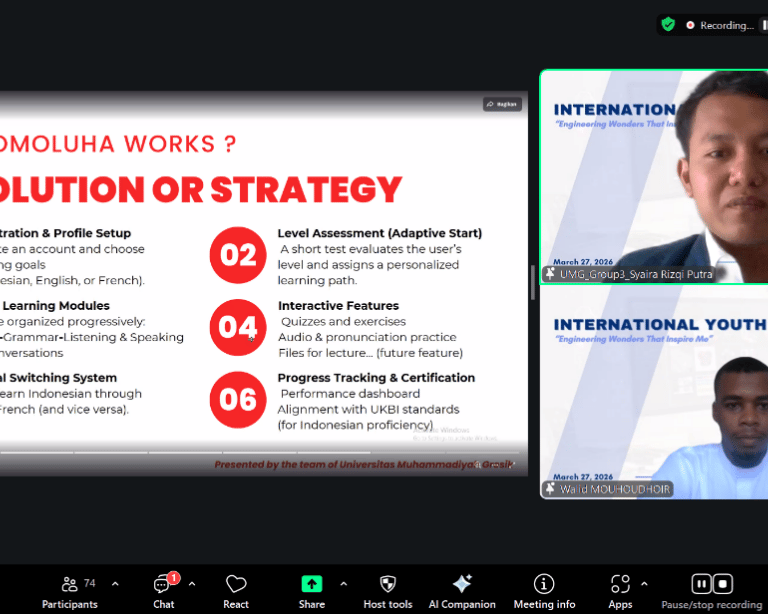 The representative team from Universitas Muhammadiyah Gresik, Indonesia presented “MSOMOLUHA,” a digital language-learning platform designed to bridge language, culture, and opportunities for international students. They highlighted that many French-speaking students studying abroad still face language barriers that affect communication, cultural adaptation, and access to opportunities. To address this, MSOMOLUHA provides interactive learning features such as vocabulary flashcards, quizzes, games, audio-visual lessons, and progress tracking to support multilingual learning. The team concluded that engineering innovation can also build connections between cultures by using technology to make language learning more accessible.