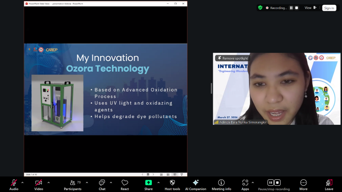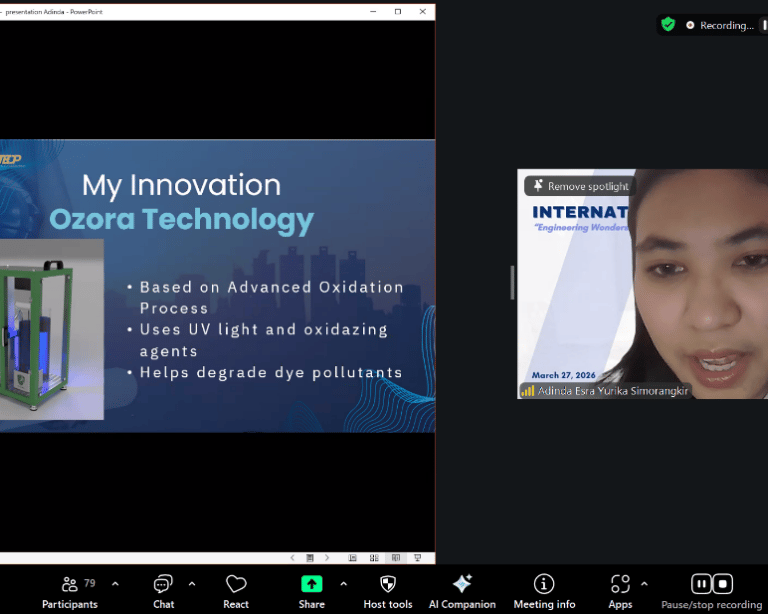 The representative team from Politeknik Negeri Samarinda, Indonesia explained that engineering wonders can begin from simple ideas and curiosity, even within a classroom or student project. They highlighted environmental pollution and industrial waste as major challenges that encourage engineers to develop sustainable technologies. The speaker also presented “Ozora Technology,” an innovation based on an Advanced Oxidation Process that uses UV light and oxidizing agents to help degrade dye pollutants and reduce environmental contamination. Additionally, the speaker shared her innovation journey as a chemical engineering student, explaining how a small idea developed on campus eventually reached the international stage when she presented it in Malaysia, showing that young engineers can create meaningful solutions through curiosity and collaboration.