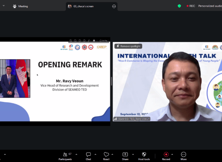 The opening remarks were delivered by Mr. Ravy Veoun, Vice Head of Research and Development Division of SEAMEO TED. He emphasized that the event was held to celebrate innovation, imagination, and the transformative power of engineering in shaping the future. He highlighted that in today’s era, ideas have the potential to change the world, and engineering plays a crucial role in turning those ideas into structures and systems that solve real-world problems, build sustainable communities, and create opportunities that improve people’s lives. He also mentioned that youth are at the heart of this transformation, as the younger generation brings fresh perspectives, creativity, and the courage to explore new possibilities. Therefore, the Youth Talk was not only intended as a discussion forum, but also as a platform for connection, where young people from different cultures could share perspectives, inspire one another, and be encouraged to think bigger and smarter about the future.